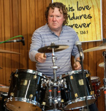 Adrian Woodhead is the driving heartbeat of Play It Forward — a cracking kit drummer with rock-solid timing, big energy, and the ability to lift the whole band the moment he starts playing. He’s our very own version of Animal from The Muppets… just slightly more house-trained.